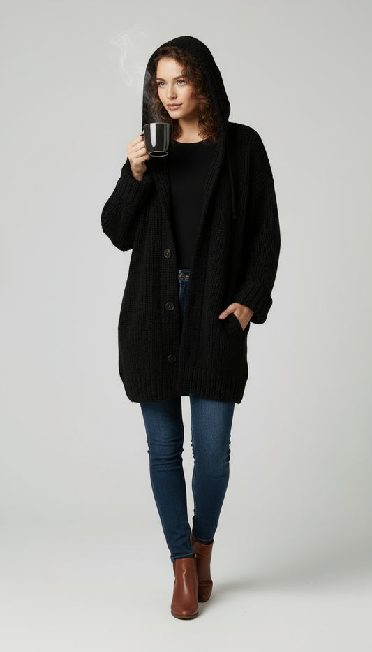 Loose-fitting mid-length hooded sweater